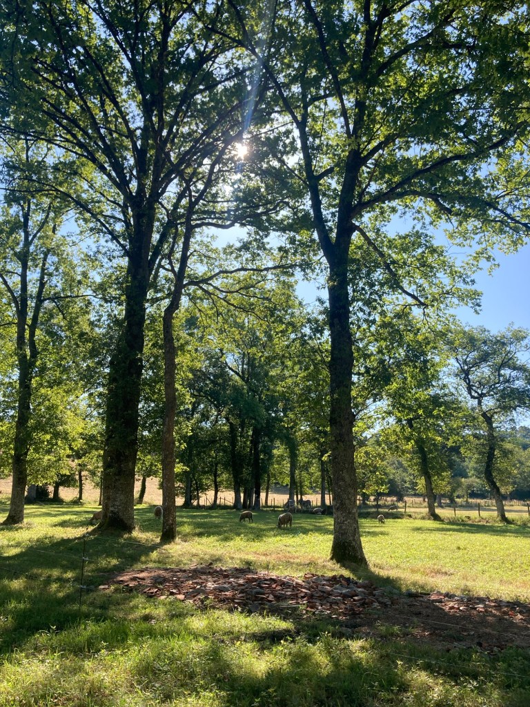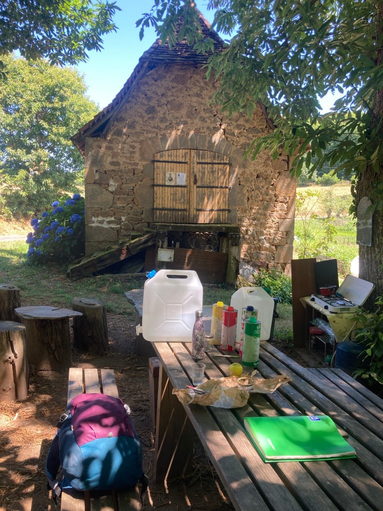 La chaleur étant montée peu à peu pendant tout le jour, j’ai exceptionnellement fait une longue pause pour déjeuner dans un endroit étonnant aménagé par Bernard, un gars du coin qui, avec son épouse, a installé une table en bois sous les arbres près de son poulailler, disposant là de l’eau, des sirops, du thé, du café… tout cela à disposition des promeneurs. Alors que je me sentais un peu seule, je fus rejointe par trois autres marcheurs : Renaud et Didier, sexagénaires flamboyants anciens copains de lycée, accompagnés de l’un des fils de Didier, Simon. Nous passâmes une excellente pause déjeuner à rire et à bavarder – je les retrouverais d’ailleurs quelques heures plus tard avec plaisir au bistrot de la Capelle Marival (en sortant de la messe…) pour partager une bière avant de rentrer dîner et nous coucher dans nos gîtes respectifs.