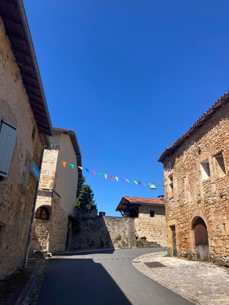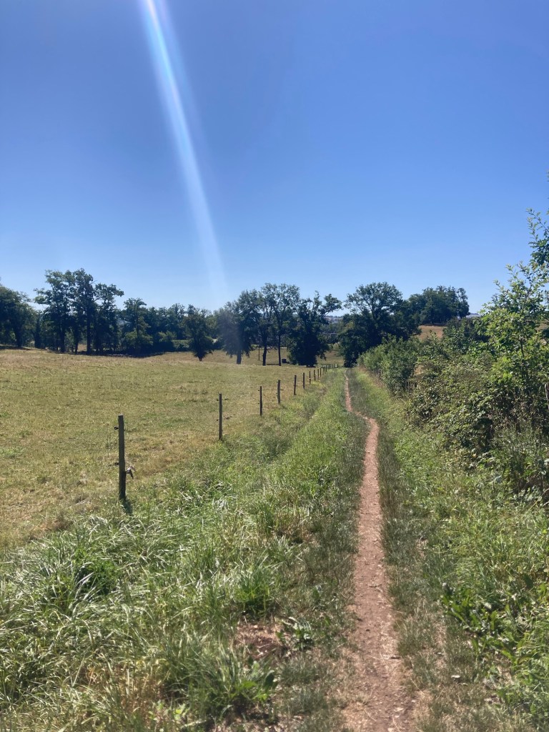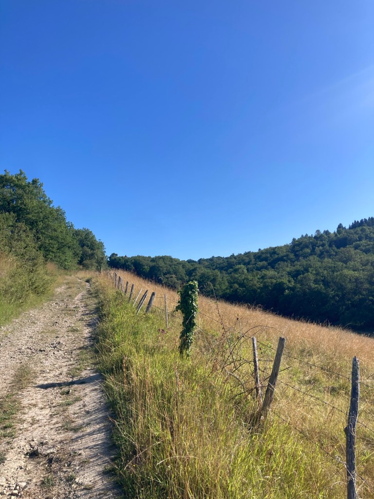 J’écris cet article le lendemain de cette étape, qui fut peut-être ma favorite du parcours jusqu’à maintenant (quoique toutes les étapes me plaisent et me donnent des raisons de me réjouir). Ce ne fut pas la plus facile, ce fut l’une des plus difficiles en fait : on franchit au total 720 m de dénivelé, dans des reliefs vallonnés, en passant par certaines portions de route pentues écrasées de soleil. On passe aussi par des sentiers forestiers somptueux et l’on traverse l’étonnant village médiéval de Cardaillac, à quelques kilomètres au nord de Figeac. Selon les étapes du parcours, on est entouré soit de hauts arbres, soit de rayonnantes prairies d’élevage et de fourrage, en traversant des villages pimpants, aux clochers pointus et aux toits de tuiles rouges. La terre elle-même devient ocre au fur et à mesure que le temps passe et cela rend la route encore plus belle.