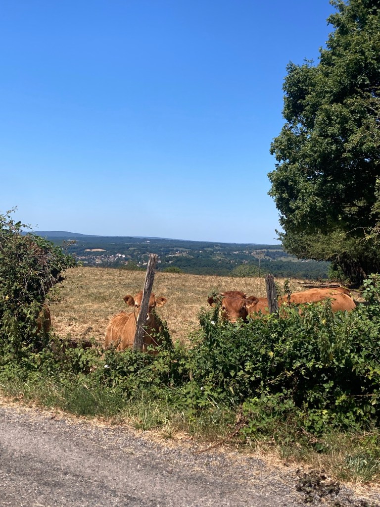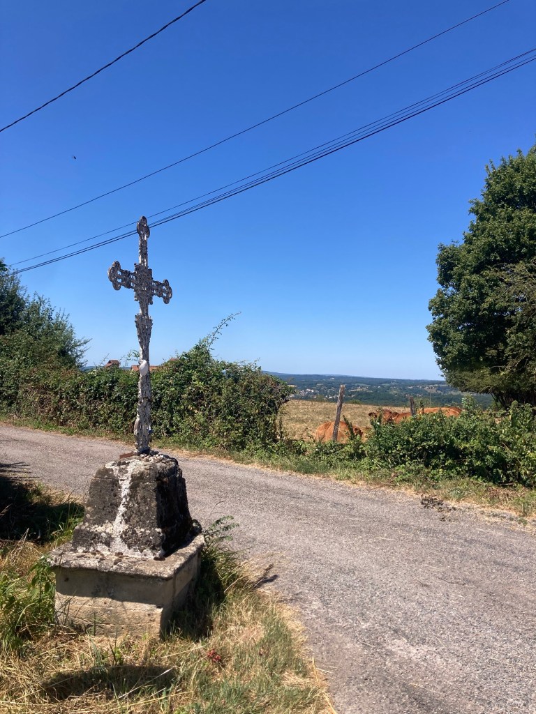 Un beau troisième jour se termine. La météo est bonne : le soleil brille, l’ombre est fraîche, l’air était piquant ce matin. Partie aux alentours de 7h30 de Livinhac, j’ai pu avaler les vingt-cinq kilomètres de façon quasiment ininterrompue jusqu’à Figeac et suis arrivée au gîte suivant aux alentours de 13h. La route était encore différente aujourd’hui, très champêtre, bocagère, avec beaucoup de sentiers situés le plus souvent sous le couvert forestier. Quelques passages sous le soleil qui tape en bord de départementale pour avoir le sentiment de faire quand même des efforts, deux rosaires récités, des rencontres avec des vaches au regard circonspect, quelques brebis, de jolis calvaires croisés en chemin : un vrai bonheur.